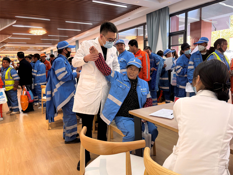 爱心义诊送健康,环卫工人有“医”靠。10月22日至10月23日,为关心环卫工人的身体健康,增强环卫工人的疾病预防意识,感谢环卫工人的辛苦付出,区环卫中心联合区卫健局在全民健身中心户外劳动者驿站和中华西路步行街为全区2000余名一线环卫工人开展爱心义诊活动。通过面对面的健康咨询、专业的医疗检查与疾病防治知识普及,为辛勤耕耘在城市清洁一线的环卫工人送上实实在在的关怀与健康保障。