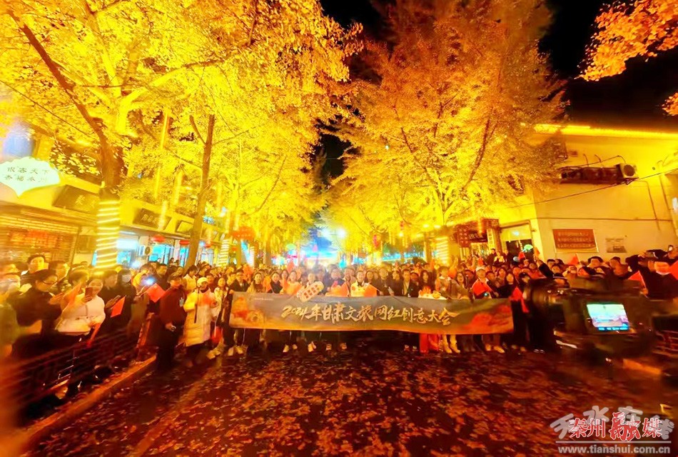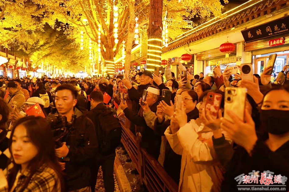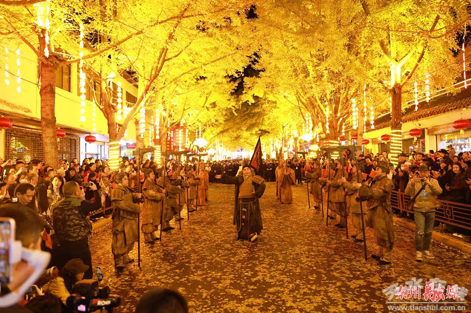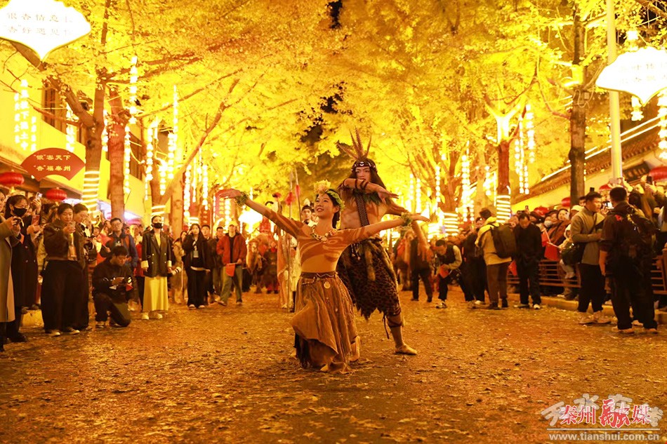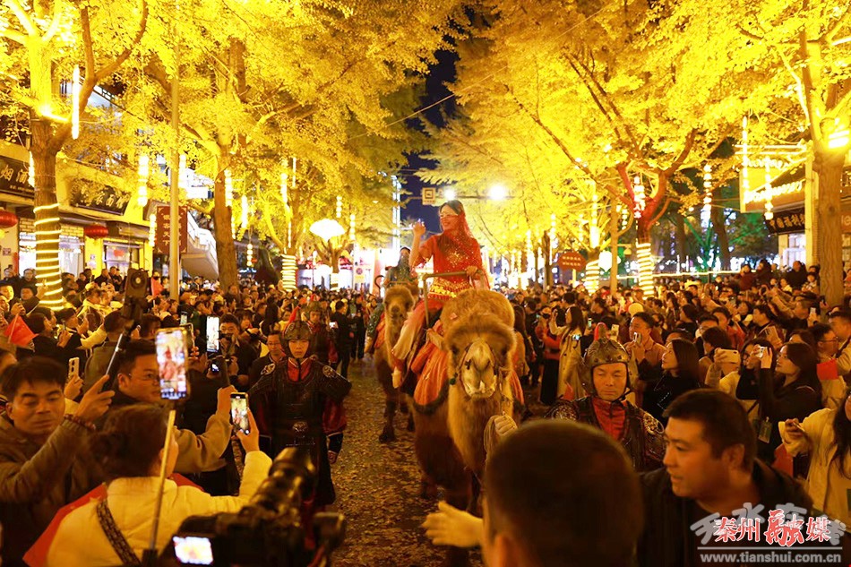 夜幕降临,银杏叶在灯光的加持下,金光灿灿、绚丽多彩,大道上人流如潮、摩肩接踵。活动现场,以天水元素原创的历史文化剧目《梦回天水》展现了天水深厚的历史文化底蕴,随后《丝路风情》《伏羲女娲》《诗意秦州》《银杏公主》等具有秦州气韵的节目轮番上演,让现场游客欣赏到满是秦州味的文化盛宴,网红、媒体达人更是通过直播和镜头将美丽秦州全网推广。