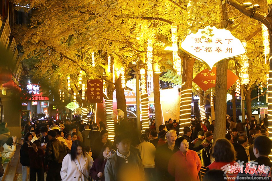 与往年不同,今年的“黄金大道”诗意盎然。银杏树上新挂了诗词吊条灯光,赏景、品诗词,金黄的银杏叶与多彩灯光交相辉映,让“黄金大道”的景色更加迷人,意境更加深远。盛景“银”客天下,尽显“杏”福秦州,此刻,这里成为触手可及的诗与远方。