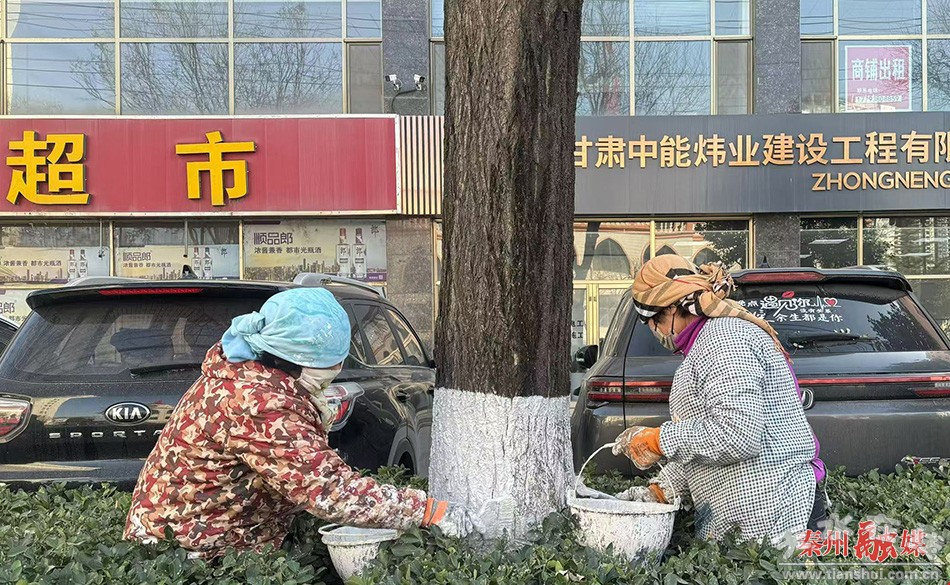 在羲皇大道、天水西高速出口等路段,道路两旁的树木迎来了“换装季”,秦州区园林建设服务中心工作人员正在为道路两旁和绿化带内的树木进行涂白。他们一手提着装满涂料的小桶,一手拿着刷子,严格按照树干基部向上1.2米的基准线进行刷白,并细致地在树皮缝隙、孔洞处反复涂刷,让树木的“新衣服”既防寒又美观。