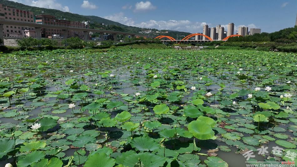 秦州区融媒体中心7月10日讯(记者 赵婷 高世飞 杨文慧)“接天莲叶无穷碧,映日荷花别样红。”近日,藉河风情线生态景观长廊湿地体验区,满池荷花渐次绽放,微风拂过,荷叶轻轻摇曳,为炎炎夏日增添了一抹清凉与雅致。游客们漫步在栈道上,或拍照留念,或静静欣赏,陶醉在这如诗如画的景致中。