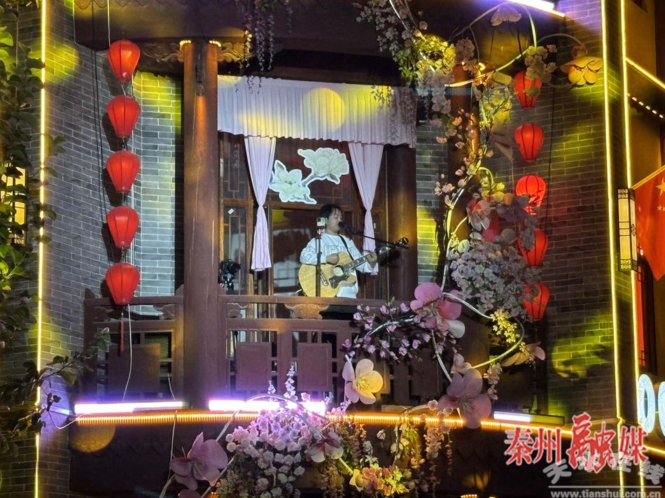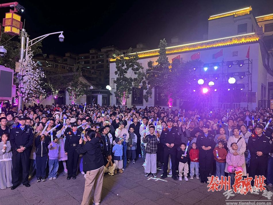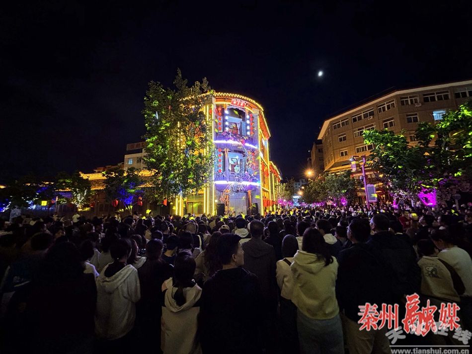 除“秦州食光”美食街外,自由路另一侧衔月阁转角楼演出同样火爆。小广场被游客围得水泄不通,楼阁上熟悉的旋律响起,观众纷纷挥舞荧光棒、点亮手机手电筒回应。一首首经典歌曲引发全场共情互动,现场高潮迭起,热闹非凡。