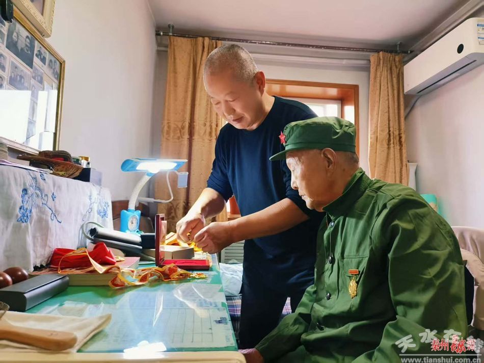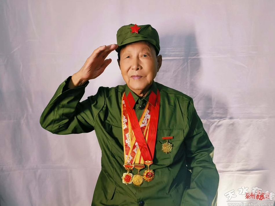 秦州区融媒体中心10月3日讯(记者高世飞)胸前的奖章熠熠生辉,绿色军装里藏着烽火记忆。96岁的抗战老兵贾维三,从10岁起加入八路军,到亲历百团大战、黄崖洞保卫战的战士,再到硝化棉车间里与死神较量的军工骨干,最后成为军工厂的筹建者,贾维三用一生书写了“家国”二字的重量,在历史长河中刻下“捍卫祖国”的铮铮誓言。