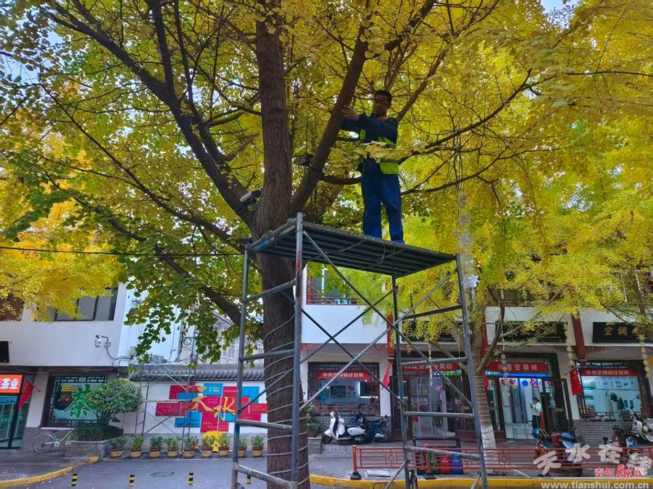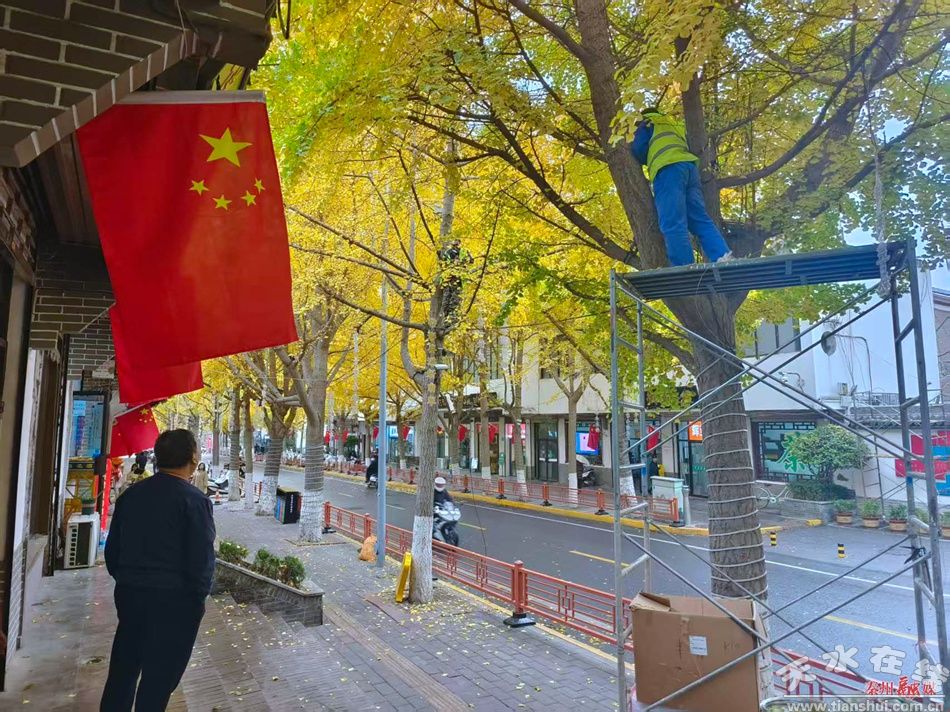 走进青年北路,满目皆是耀眼的金黄,微风拂过,银杏叶如蝴蝶般翩跹飘飞。工作人员们忙碌其间,大家在银杏树枝丫间悬挂印有秦州文化元素的诗词灯条,或缠绕色彩明快的彩带,调试金黄色投光灯、LED轮廓灯,为夜间观赏做足准备。