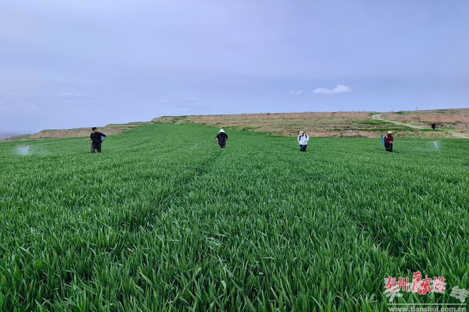 在汪川镇的田间地头,青绿的麦苗随地势铺展,风过之处绿浪起伏,焕发出勃勃生机。天水市艺鹏种养殖农民专业合作社的工人们背着喷雾器,在麦田中来回穿梭,均匀地将药液喷洒在麦苗上。与此同时,农技人员与种植户围蹲在田埂上,仔细查看麦苗长势、测量土壤墒情,现场指导施肥作业,确保管护措施落地见效。