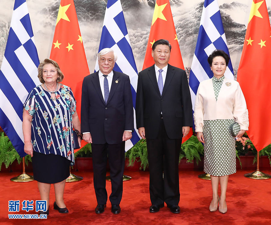 5月14日,国家主席习近平在北京人民大会堂同希腊总统帕夫洛普洛斯举行会谈。这是习近平和夫人彭丽媛同帕夫洛普洛斯夫妇合影。 新华社记者 鞠鹏 摄