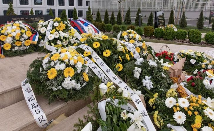 这是2022年5月7日在塞尔维亚贝尔格莱德的中国驻南斯拉夫联盟大使馆旧址纪念碑前拍摄的花圈。新华社发(王韡 摄)