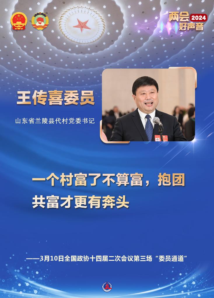 山东省兰陵县代村党委书记王传喜委员带来了村里的好消息:通过发展特色产业、走农文旅融合发展之路,2023年村民人均纯收入7.2万元。