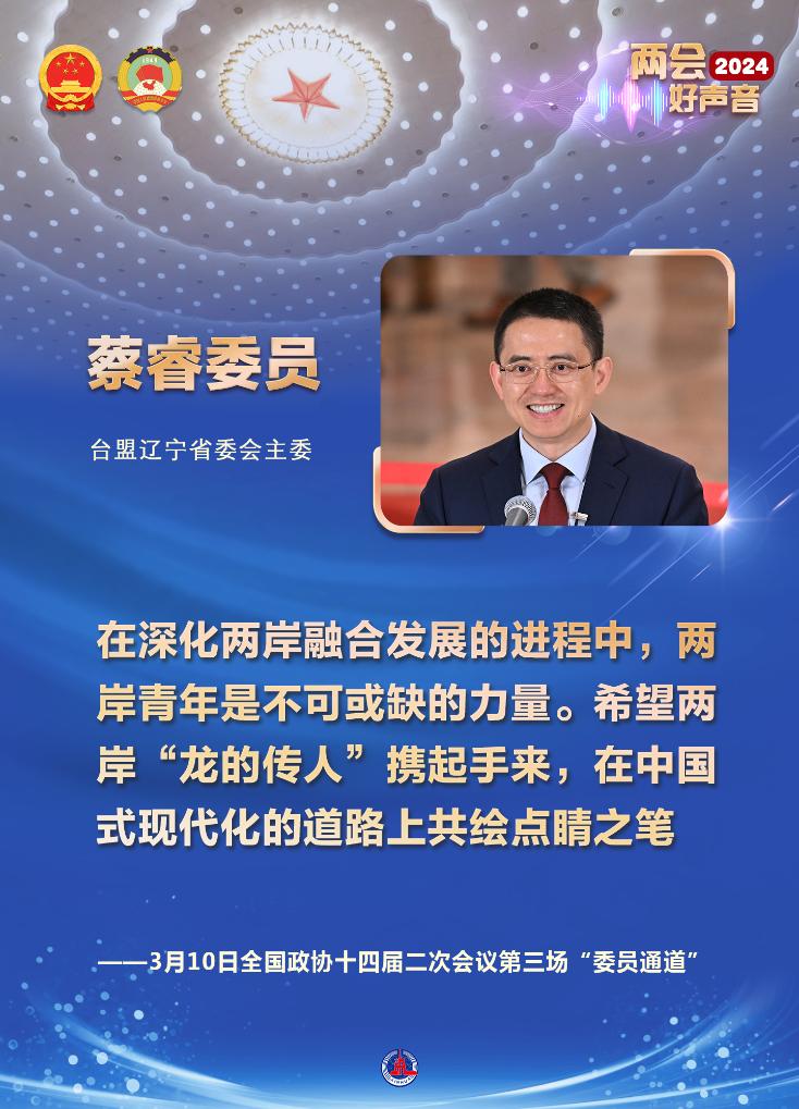 台盟辽宁省委会主委蔡睿委员走上通道时,特意扎了一条红色的领带。“今年是我的本命年——龙年。中华儿女对龙都有一种特殊的感情。”他说,在深化两岸融合发展的进程中,两岸青年是不可或缺的力量。希望两岸“龙的传人”携起手来,在中国式现代化的道路上共绘点睛之笔。