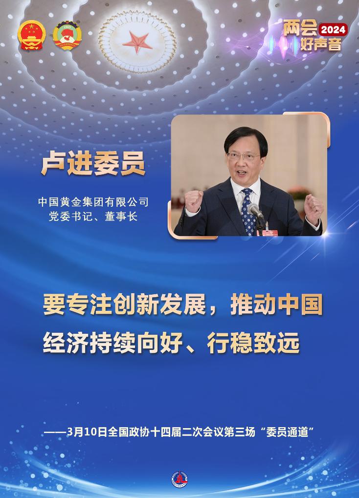 中国黄金集团有限公司党委书记、董事长卢进委员用身边的例子道出国资央企的责任与使命。卢进说,要专注创新发展,推动中国经济持续向好、行稳致远。