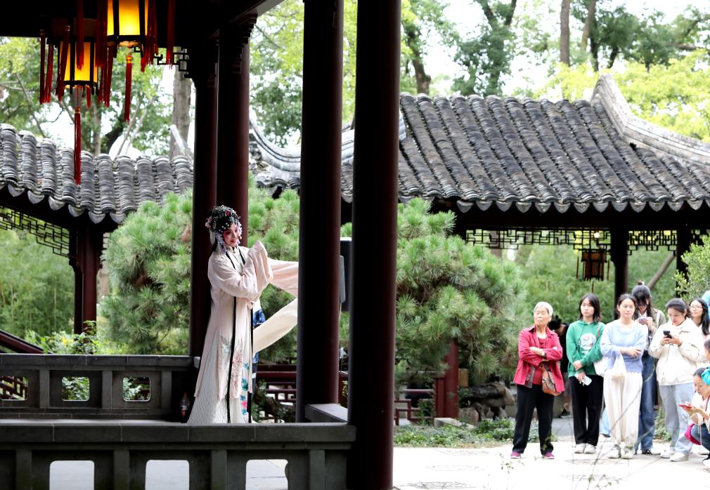 10月19日,演员在苏州虎丘山景区为游客表演昆曲。新华社发(杭兴微 摄)