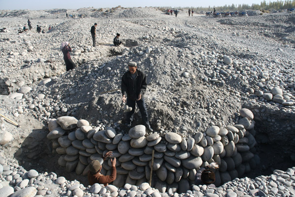 一块玉料放在诸位面前,也许你怎么也不会把它与一件精美的玉器联系起来。正因为如此,才出现了“传国玉玺”动人的故事,楚人卞和好心献玉璞,就是因为没有识宝之士的鉴定,蒙受了欺君之罪,被剁去了双手双脚。我站在河边,眼中只有石没有玉,而河床上数不清的维吾尔汉子、老人、女子,甚至包括小孩,都是肩扛镐头,手提铁锹,深挖下一个个大坑,掏取谁也梦想得到的美玉。由于多年的开采和捡拾,和田的玉石已日渐稀少,早已没有可能像周穆王当年西巡到昆仑“取玉三乘”、“载玉万只”的盛况。像眼前这几位精壮的维吾尔族汉子,干几天才能在旧河床上挖出房间大的一个坑,而这个坑里有多少立方的石头呢?每一块石头都要经过他们的手指梳理,而收获往往甚微!想一想看,几十立方的石头,坚硬的石头与他们的十指厮磨,软硬兼施,这是最有耐心、需要韧性的工作。残破磨损流血的十指,抵抗着也企盼着石头,从石头中发现石头,从一般石头中发现特殊的石头,从芸芸众生中找出石的帝王。