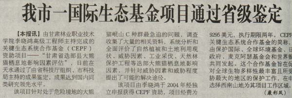 由甘肃林业职业技术学院李晓鸿高级工程师主持完成的关键生态系统合作基金(CEPF)资助项目——“甘肃省迭部县大熊猫栖息地影响因素评估”,日前在天水通过了由省科技厅组织、市科技局主持的成果鉴定,成果达到国内同类研究领先水平。