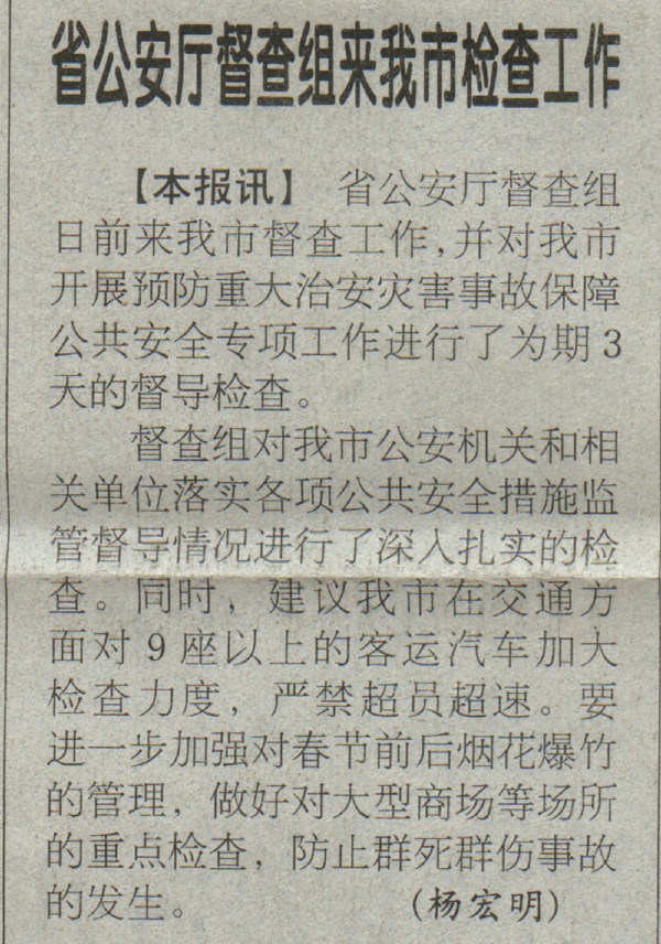 省公安厅督查组日前来我市督查工作,并对我市开展预防重大治安灾害事故保障公共安全专项工作进行了为期3天的督导检查。 督查组对我市公安机关和相关单位落实各项公共安全措施监管督导情况进行了深入扎实的检查。同时,建议我市在交通方面对9座以上的客运汽车加大检查力度,严禁超员超速。要进一步加强对春节前后烟花爆竹的管理,做好对大型商场等场所的重点检查,防止群死群伤事故的发生。