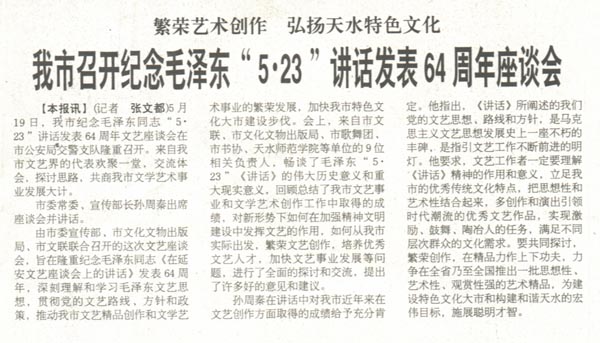 由市委宣传部、市文化文物出版局、市文联联合召开的这次文艺座谈会,旨在隆重纪念毛泽东同志《在延安文艺座谈会上的讲话》发表64周年,深刻理解和学习毛泽东文艺思想,贯彻党的文艺路线、方针和政策,推动我市文艺精品创作和文学艺术事业的繁荣发展,加快我市特色文化大市建设步伐。会上,来自市文联、市文化文物出版局、市歌舞团、市书协、天水师范学院等单位的9位相关负责人,畅谈了毛泽东“5·23”《讲话》的伟大历史意义和重大现实意义,回顾总结了我市文艺事业和文学艺术创作工作中取得的成绩,对新形势下如何在加强精神文明建设中发挥文艺的作用,如何从我市实际出发,繁荣文艺创作,培养优秀文艺人才,加快文艺事业发展等问题,进行了全面的探讨和交流,提出了许多好的意见和建议。