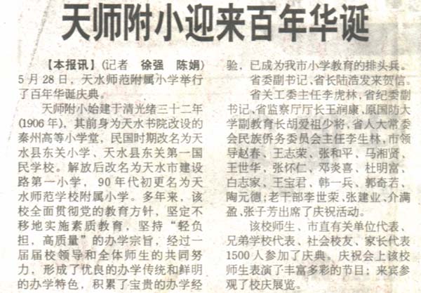 ¡¡¡¡Ììʦ¸½Ð¡Ê¼½¨ÓÚÇå¹âÐ÷ÈýÊ®¶þÄê(1906Äê)£¬ÆäǰÉíΪÌìË®ÊéÔº¸ÄÉèµÄÇØÖݸߵÈСѧÌã¬Ãñ¹úʱÆÚ¸ÄÃûΪÌìË®ÏØ¶«¹ØÐ¡Ñ§¡¢ÌìË®ÏØ¶«¹ØµÚÒ»¹úÃñѧУ¡£½â·Åºó¸ÄÃûΪÌìË®Êн¨Éè·µÚһСѧ£¬90Äê´ú³õ¸üÃûΪÌìˮʦ·¶Ñ§Ð£¸½ÊôСѧ¡£¶àÄêÀ´£¬¸ÃÐ£È«Ãæ¹á³¹µ³µÄ½ÌÓý·½Õ룬¼á¶¨²»ÒƵØÊµÊ©ËØÖʽÌÓý£¬¼á³Ö¡°ÇḺµ££¬¸ßÖÊÁ¿¡±µÄ°ìѧ×ÚÖ¼£¬¾¹ýÒ»½ì½ìУÁìµ¼ºÍÈ«ÌåʦÉúµÄ¹²Í¬Å¬Á¦£¬ÐγÉÁËÓÅÁ¼µÄ°ìѧ´«Í³ºÍÏÊÃ÷µÄ°ìÑ§ÌØÉ«£¬»ýÀÛÁ˱¦¹óµÄ°ìѧ¾Ñ飬ÒѳÉΪÎÒÊÐСѧ½ÌÓýµÄÅÅÍ·±ø¡£