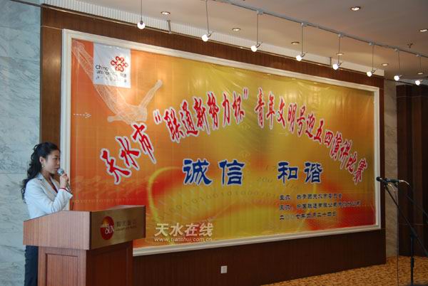 【本报讯】(记者 张春昌)4月24日下午,由团市委、中国联通有限公司天水分公司主办的市“联通新势力杯”青年文明号迎“五四”演讲比赛在阳光饭店举行。