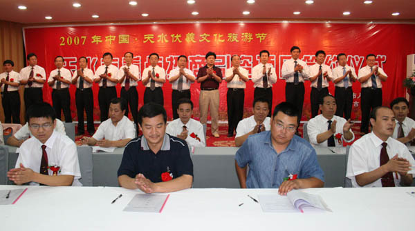 【本报讯】(记者 郝勤学)6月23日上午,2007年中国·天水伏羲文化旅游节天水市重点招商引资项目签约仪式在天水迎宾馆举行,两区五县的60个重点招商引资项目进行了集中签约。市领导虞海燕、张广智、张国华、张怀仁、张健、赵卫东出席签约仪式。