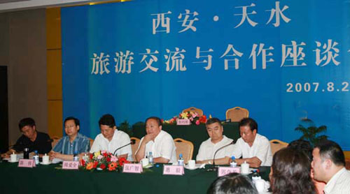 【本报讯】(记者 张树平)8月25日,西安·天水旅游交流与合作座谈会在天水宾馆召开。市委副书记、市长张广智出席座谈会。市委常委陈伟主持会议,副市长郭奇若致欢迎词。西安和天水两地旅游局、电视台及旅行社相关负责人参加座谈会。