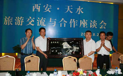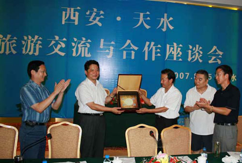 西安客人对我市的旅游业发展提出了很多好的建议。他们指出,要从资源挖掘上多下功夫,除了麦积山以外,要对天水自然资源、伏羲文化多作广泛宣传,充分利用网络加大宣传力度。利用道路交通、民航、铁路整合旅游资源,在“十一”黄金周到来之前,多投放宣传资料,组织客源,扩大旅游市场。要加强硬件设施建设,用高质量的服务,展示天水“中国优秀旅游城市”的亮丽形象。会上,双方还签署了旅游合作协议。