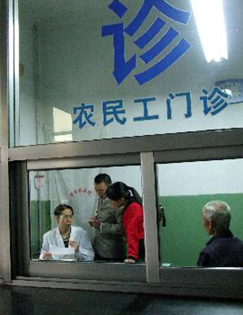 9月30日,几名农民工在天水市中医院开设的“农民工门诊”看病。为解决农民工看病难的问题,甘肃天水市中医院近日开设了“农民工门诊”,看病的农民工免收挂号费,还实行单处方最高限价。