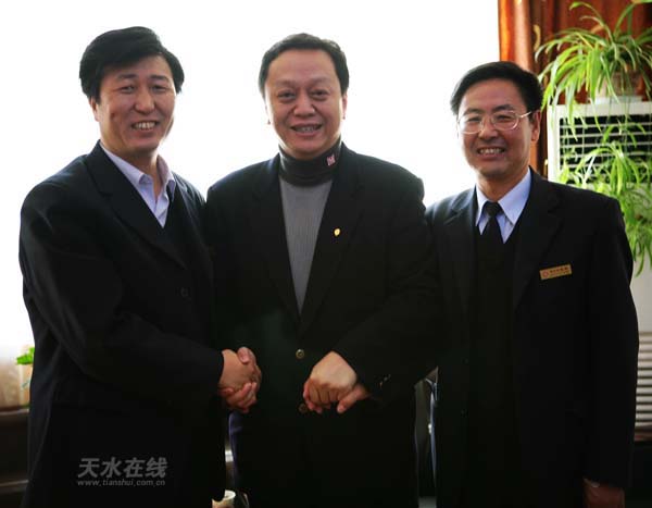 (中国之音广播公司总裁谢建华先生(中)与天水四零七医院院长杨友良(左)、院党委书记许定武携手实施本次慈善活动。)