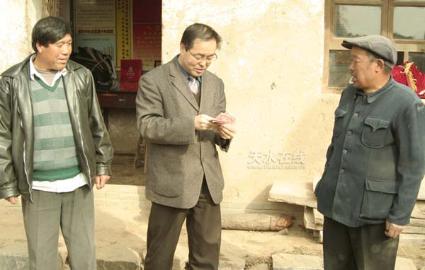 天水市第二人民医院副院长杨国栋把全院职工捐献的2000元人民币送到村支书的手中