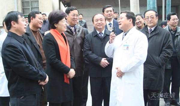 12月4日,甘肃省副省长咸辉在省政府副秘书长张正锋、省卫生厅厅长侯生华、省计生委主任刘维忠、省文化厅副厅长李慎宾、市长张广智,副市长赵卫东、市卫生局局长史俊清、麦积区委书记蒋晓强、区长张克强等领导的陪同下到天水市第二人民医院视察指导工作,咸辉副省长深入科室与患者亲切交谈,询问患者病情及治疗情况,对该院的各项工作给予了充分肯定。