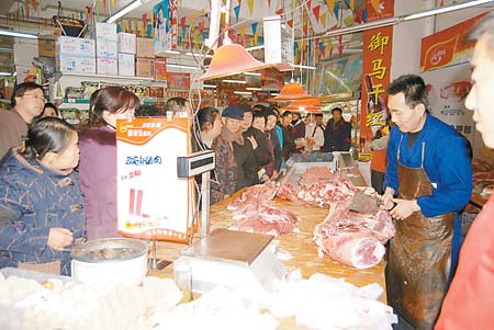 2007年12月31日,市民在麦积区景园商厦超市排队购买猪肉。当天市政府为市内7家大型超市投放储备猪肉330头。