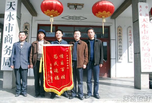 天水在线讯 3月13日下午,秦州区藉口镇缑家庄村的村主任和村支书,将一面写有“情系百姓,为民造福”的锦旗送给天水市商务局,并连声说:“谢谢你们。”