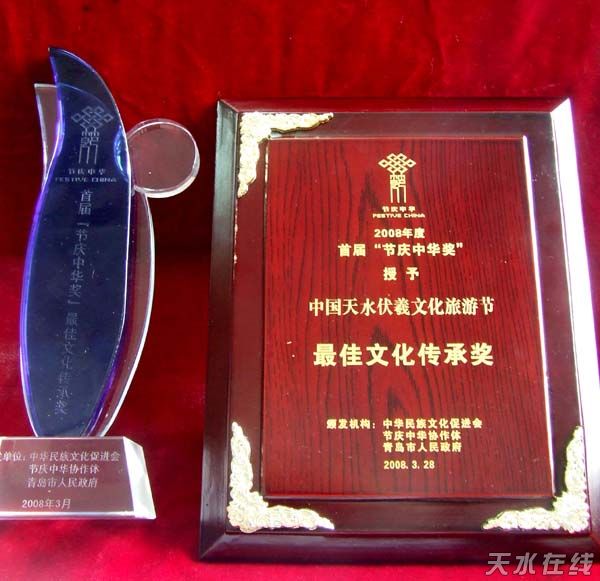 天水在线青岛讯(记者张小平)春风和煦,万物复苏。由中华民族文化促进会、节庆中华协作体理事会、青岛市人民政府共同主办的首届“节庆中华奖”颁奖典礼暨2008节庆中华协作体年会3月28日在风景秀丽的“奥帆之都”——青岛隆重举行。我市伏羲文化节荣获“最佳文化传承奖”。这是继2006年获“最具发展潜力十大节庆活动”之后的又一殊荣。