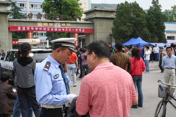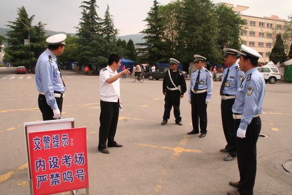 2008年高考于6月7日至9日在我市如期举行。为了给38600余名高考考生营造一个安全、安定、安静的考试环境,保障7个考区38个考点周边交通秩序有序、安全、畅通、无噪音,天水市公安局交警支队全警动员,全员上路,推出以下措施为今年高考保驾护航: