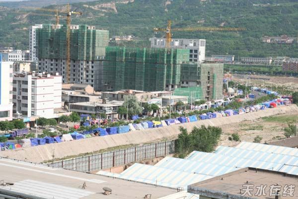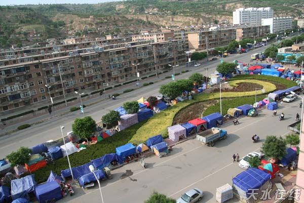 天水市市長李文卿今天說:「前一段,我們做了一些動員工作,街上的帳篷剛由2萬多頂減至1萬多頂,最近的幾次餘震又讓市民恐慌起來,街上的帳篷又多起來,現在大約有3、4萬頂了。我們目前擔心的是,這麼多人住在街上,天越來越熱,公共衛生成為最大的問題。同時,市民都需要一個較穩定的情緒,這對城市秩序很重要,另外,許多人都住在帳篷,居民樓都空了,而在人員密集的公園、體育場、沿街路面、空曠地帶亦可能出現一些偷盜、搶劫等事件。目前,市政府面對的頭等大事是既要科學有效引導市民防餘震,又能保持良好的生產生活秩序、城市秩序。我們著力於引導市民做好科學的防震預案,同時,我們亦努力疏導市民情緒,撫慰恐慌心理。今天,我們到學校去看望了參加高考的一些學生並和部分家長進行交流和溝通,希望他們都能保持較穩定的情緒,以良好的狀態應對好高考。」