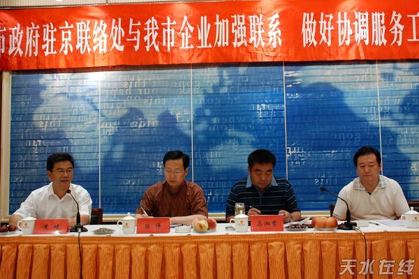 马湘贤、陈伟对驻京联络处的工作给予了充分肯定,并指出,座谈会的召开是贯彻落实市委五届四次全委(扩大)会议精神及市委关于在全市深入开展党员干部纪律作风集中教育整顿活动安排的具体体现,具有很强的针对性、现实性和实效性。马湘贤、陈伟指出,企业要想生产经营发展必须要有良好的外部环境,驻京联络处具有得天独厚的资源优势和便利条件,要切实为企业项目衔接、资金争取、招商引资等方面提供帮助支持,促进企业上项目,做大做强,形成良性循环。马湘贤、陈伟强调,政府各部门都应增强这种服务意识,改进工作方式,转变工作作风,优化环境,共同努力,建设高效文明和谐新天水。马湘贤还特别强调,企业尤其是国有企业及国有控股企业要重视加强党建及党风廉政建设。