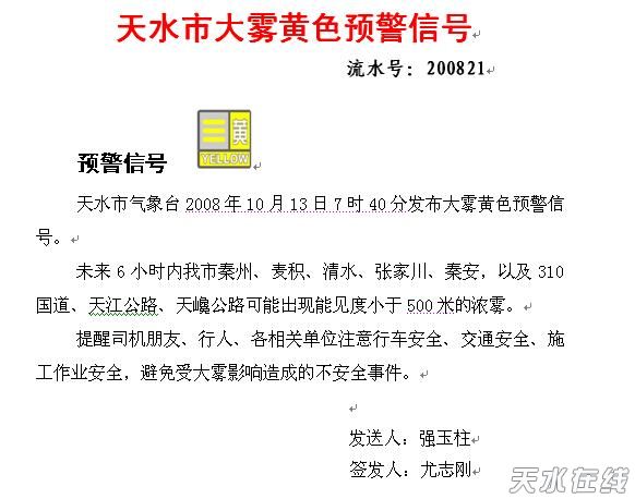 ·天水气象台13日7时40分发布大雾黄色预警信号(图)