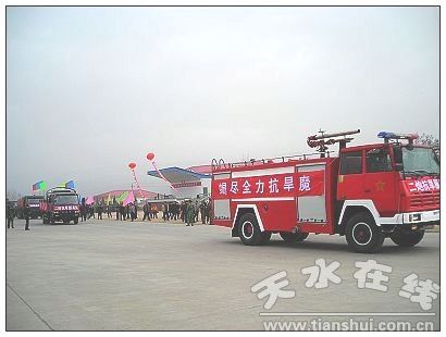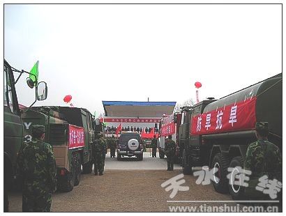 当天上午,31辆送水车整齐地排列在天水驻军某部的训练场上,大红的横幅上写着“军民携手,共降旱魔”,天水驻军向饮水极度困难村抗旱送水活动在这里启动。10时许,天水驻军某红军师、天水军分区、天水消防支队、驻武山某部等组织的31台送水车,从这里出发,为天水市五县两区15个乡镇35个饮水极度困难村、3处果园送水。由此拉开了为期5天的向饮水极度困难村抗旱送水活动的帷幕。