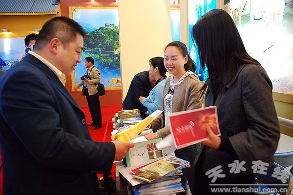 当天上午,记者在设于西安曲江国际会展中心A馆的我市旅游展示推介展台前看到,工作人员积极向每位经过天水旅游展台前的顾客发放有关天水吃、住、行、游的宣传册页,络绎不绝的客商对我市麦积山、大地湾、伏羲庙等旅游景点表示出极大的兴趣,不时有人驻足咨询了解去天水旅游的相关情况。展台一旁,我市旅游局、旅行社和景点、饭店负责人对每位客商介绍旅游景点特色,推荐旅游线路和吃住宾馆、饭店,并与来自全国各地的旅游界人士洽谈旅游合作事宜。