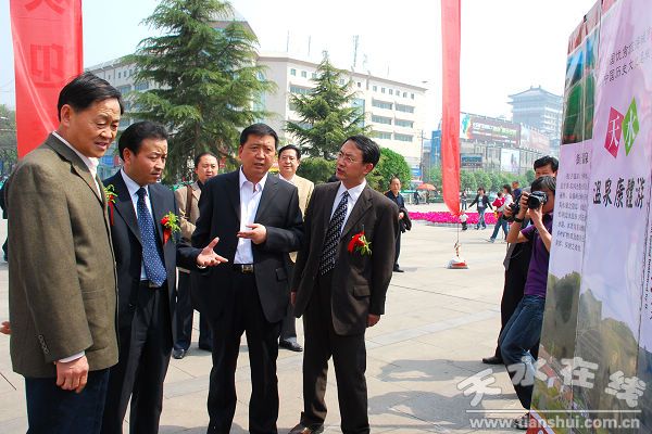 天水市委常委、副市长郭奇若向西安市旅游局副局长张文忠介绍天水旅游景点