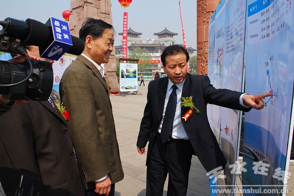天水市委常委、副市长郭奇若向西安市旅游局副局长张文忠介绍天水旅游线路