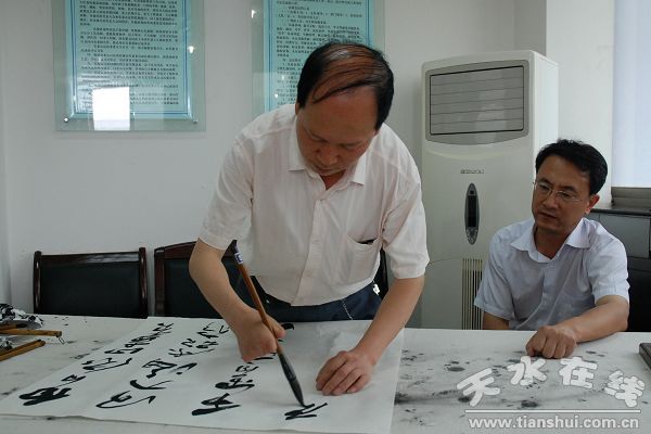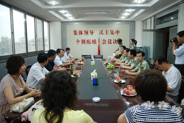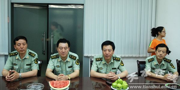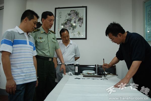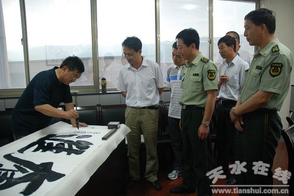7月21日上午,值此“八一”建军节即将来临之际,天水市旅游局、市文联和天水机场有限公司负责同志带着慰问品联合慰问了市消防支队官兵,并进行座谈。市文联还组织我市书法家现场为官兵挥毫献艺,充分展现了军民一家亲的鱼水之情。市旅游局、市文联、天水机场主要领导、分管领导,东关街道办事处负责人,天水在线记者等共计20余人参加了慰问活动。