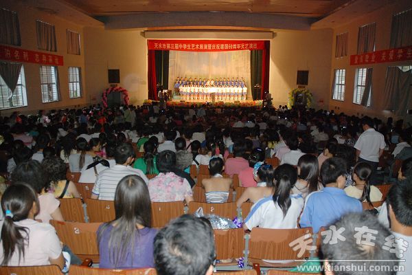 7月22日晚,由天水市教育局主办的天水市第三届中学生文艺展演暨建国60周年文艺演出在天水师院隆重举行。来自两区五县的中学生带来了他们精心准备的文艺节目,为建国60周年献上了一份厚礼。