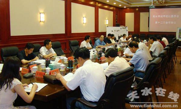 会上宣读了《甘肃省人民政府关于天水市城市总体规划(2005—2020年)的批复》,审议了我市城市近期建设项目《天水市卫生学校灾后异地重建修建性详细规划》、《秦州区北山生态环境综合整治工程》、《麦积区渭滨北路景观长廊设计方案》及审定专项修建性规划《天水市纪信祠区域规划设计方案》、《天水市历史文化名城城区紫线划定规划》等七个城市建设规划方案。参会人员就规划和建设项目进行了热烈讨论,提出了建议和意见,进一步完善了规划设想。