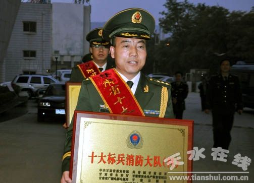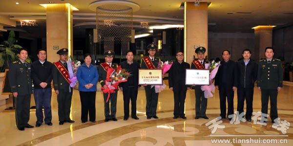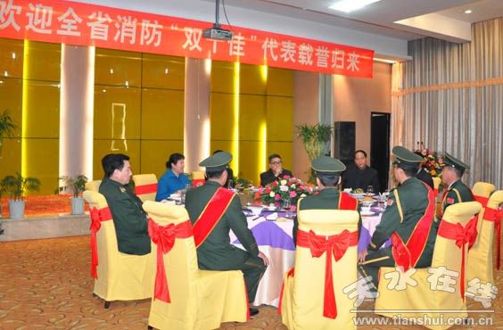 11月7日,天水市人大常委会副主任朱政英,市政府副市长萧菡,市政协副主席王凤保等四大组织领导以及市公安局副局长董银喜,消防支队支队长张东、副支队长孙晓俊等在天水宾馆隆重举行仪式热烈欢迎全省“双十佳标兵单位”和“陇原十大消防卫士”代表载誉归来。在刚刚结束的甘肃省首届“陇原十大消防卫士”、“双十佳标兵单位”评选中,天水市公安消防支队清水县大队荣获全省“十佳标兵大队”;麦积中队荣获全省“十佳标兵中队”;麦积中队中队长王洪超、三级士官汪世鹏荣获“陇原十大消防卫士”。