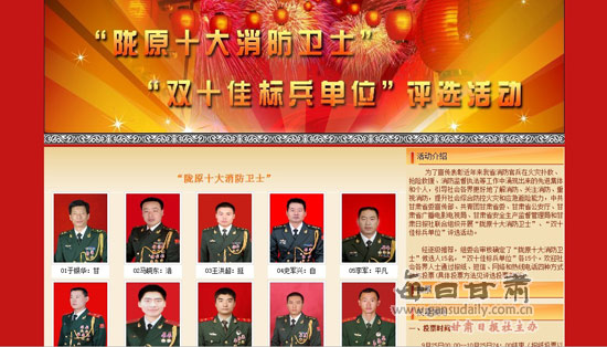 “陇原十大消防卫士”、“双十佳标兵单位”评选活动由省委宣传部、团省委、省公安厅、甘肃日报社、省广电局、省安监局共同主办。活动自今年6月开展以来,引起了社会各界的广泛关注和热情参与,截至10月20日,共收到各类选票1400多万张次。最终,张文成、陈军宽、姚建军、张泽、李军、于银华、苏仕强、成向龙、王洪超、汪世鹏当选首届“陇原十大消防卫士”;兰州市公安局城关分局消防监督科等20个单位荣获“双十佳标兵单位”。