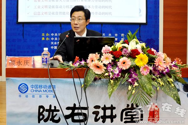 1月6日下午,天水“陇右讲堂”第五讲在市图书馆学术报告厅开讲。中国移动通信集团甘肃有限公司董事长、总经理颜永庆应邀作了《信息改变生活》的专题讲座。