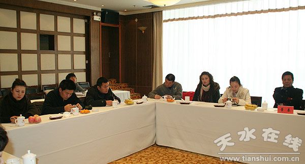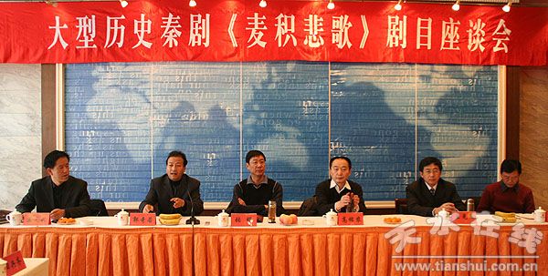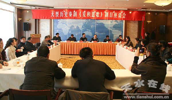 1月6日,大型历史秦剧《麦积悲歌》剧目座谈会在阳光饭店召开。省文化厅正厅级巡视员高稼农,省文化厅副厅长张明,市委常委、宣传部长王光庆,市委常委、副市长郭奇若,老干部田兴齐、介满盈,《麦积悲歌》编剧曹锐以及演职人员30多人参加了座谈会。