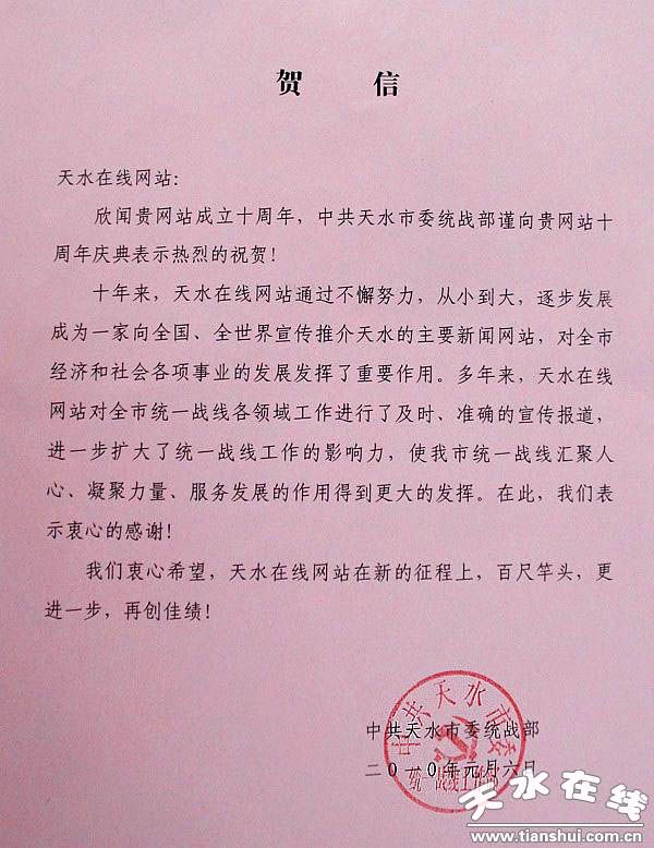 ·天水市委统战部致天水在线成立十周年贺信(图)
