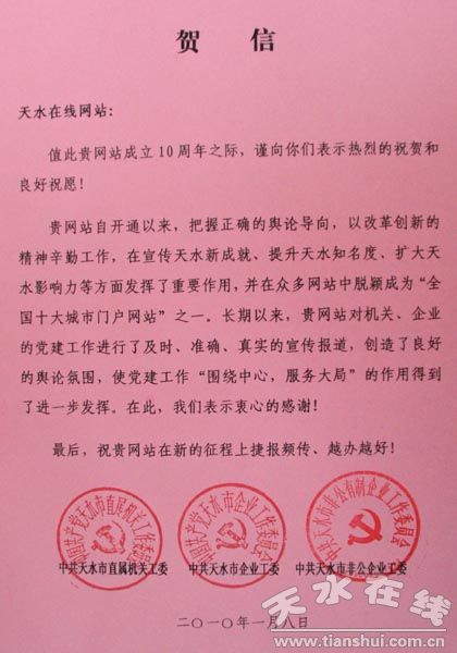 天水市机关工委致天水在线成立十周年贺信(图)