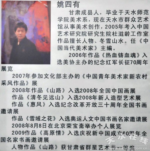 ¡¡¡¡Ò¦ËÄÓУ¬1964Äê³öÉú£¬ºÅͬ¹ÈɽÈË£¬¸ÊËàÊ¡ÃÀÊõ¼Òлá»áÔ±¡£1984Äê±ÏÒµÓÚÌìˮʦ·¶Ñ§ÔºÃÀÊõϵ¡£Éó¤ÈËÎɽˮ£¬¶àÄêÔÚ¡¶ÌìË®ÈÕ±¨¡·´ÓÊÂÃÀÊõ±à¼¹¤×÷£¬½üÆÚ¾ÍÖ°ÓÚÌìË®ÊÐȺÖÚÒÕÊõ¹Ý´ÓÊÂÃÀÊõ´´×÷¡£½áÒµÓÚÖйúÒÕÊõÑо¿Ôº¡¶¶Å×ÌÁ乤×÷ÊÒ¡·Ë¶Ê¿Ñо¿Éú°à¡£