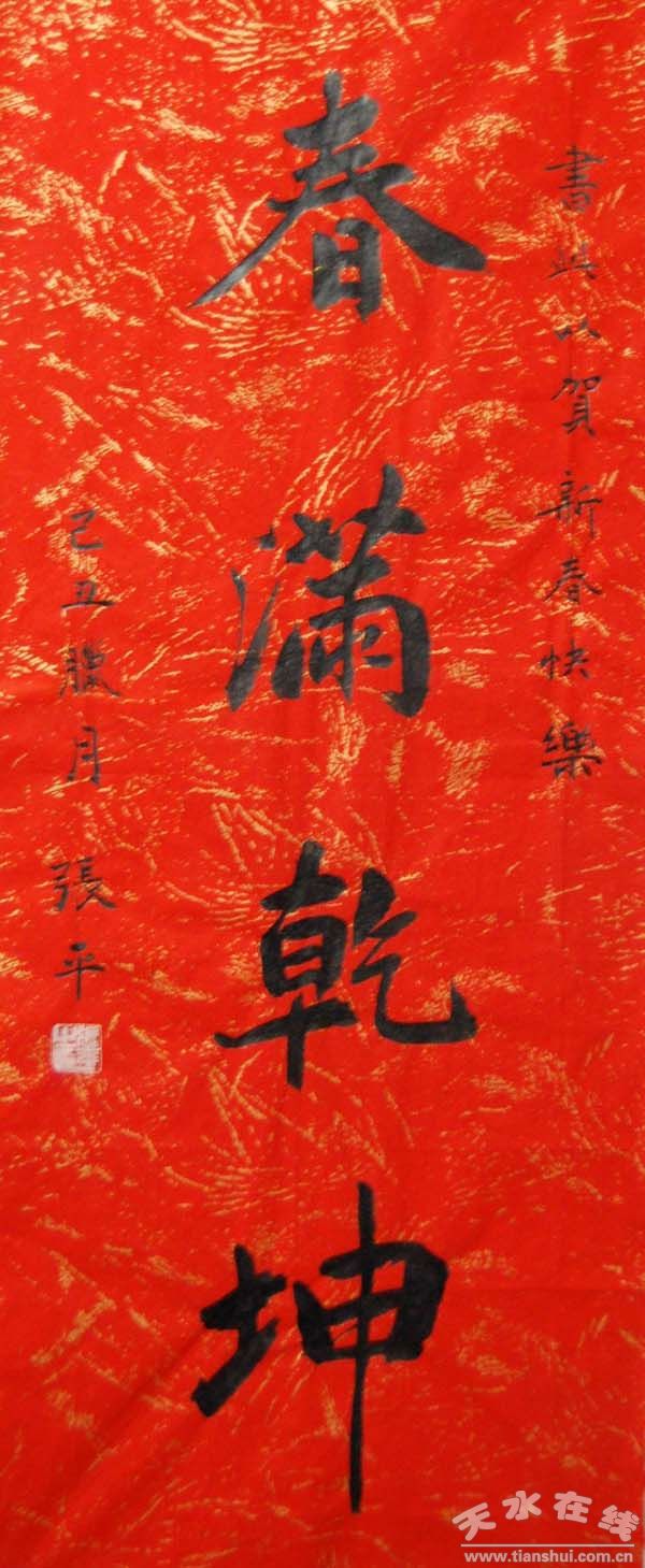 张平,1964年生,甘肃甘谷县人,中国书法家协会会员,甘肃省书法家协会创作委员会委员,民盟甘肃省委艺术家工作委员会委员,天水市青联委员,天水市书法家协会副主席,秦州区书画家协会主席。